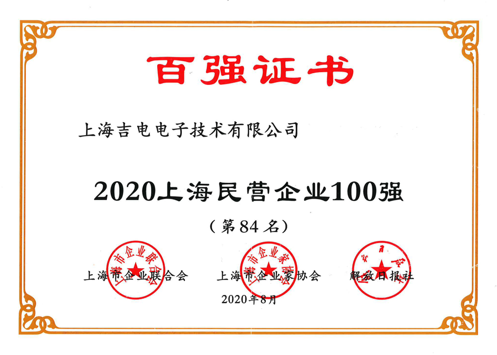 8月18日,由上海市企業(yè)聯(lián)合會、上海市企業(yè)家協(xié)會、上海市經濟團體聯(lián)合會、解放日報社等聯(lián)合主辦的“2020上海百強企業(yè)發(fā)布會”在滬召開。上海吉電電子技術有限公司再次榮登上海民營百強企業(yè)榜,并位居第84位。