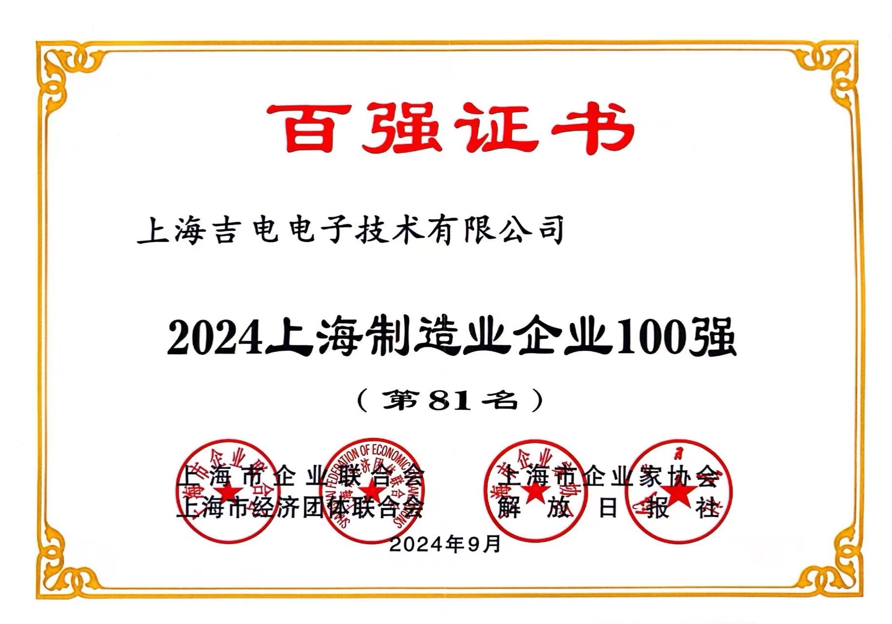 2024年上海百強發(fā)布,吉電電子獲得上海制造業(yè)企業(yè)百強(81),上海民營制造業(yè)企業(yè)百強(56)排名。